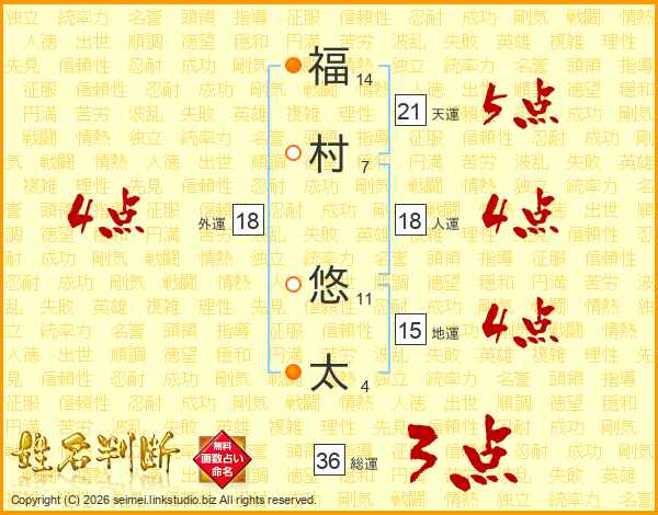 福(14画)村(7画) 悠(11画)太(4画)