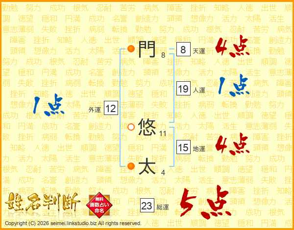 生活面を象徴する運勢です。外部から受ける影響力を表し、結婚運、家庭運や職場、環境への順応性を表します。総運から人運を引いた画数。姓や名が1文字の場合を除く。