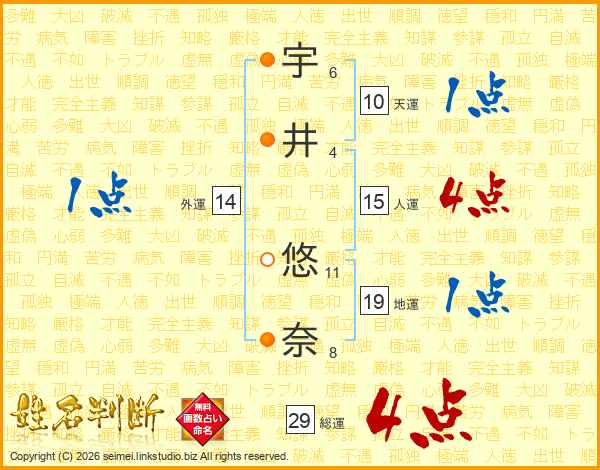 宇(6画)井(4画) 悠(11画)奈(8画)