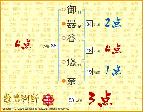 御(11画)器(16画)谷(7画) 悠(11画)奈(8画)