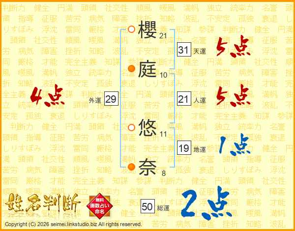 櫻(21画)庭(10画) 悠(11画)奈(8画)
