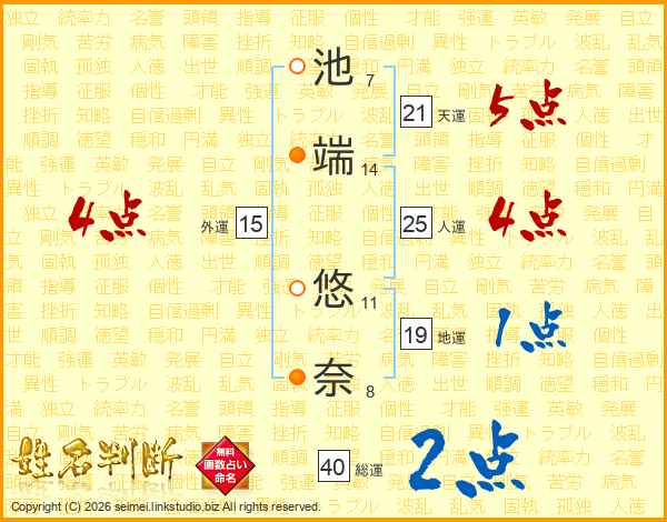 池(7画)端(14画) 悠(11画)奈(8画)