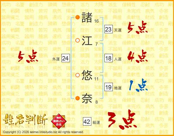 諸(16画)江(7画) 悠(11画)奈(8画)