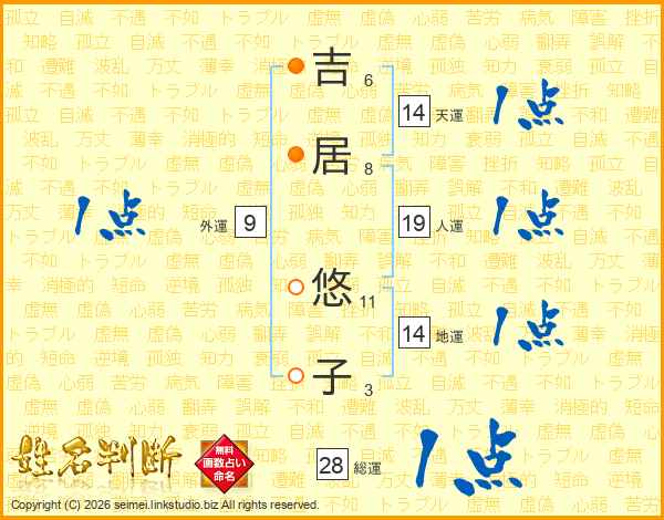 生活面を象徴する運勢です。外部から受ける影響力を表し、結婚運、家庭運や職場、環境への順応性を表します。総運から人運を引いた画数。姓や名が1文字の場合を除く。