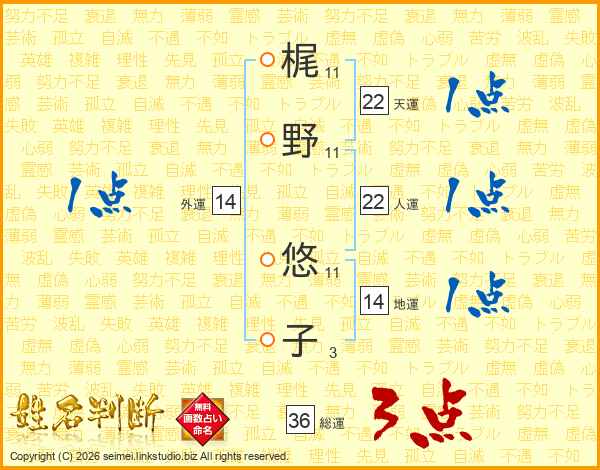 生活面を象徴する運勢です。外部から受ける影響力を表し、結婚運、家庭運や職場、環境への順応性を表します。総運から人運を引いた画数。姓や名が1文字の場合を除く。