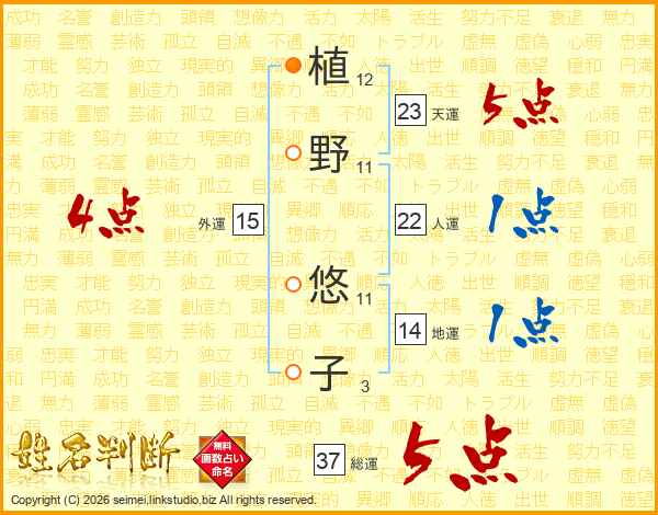 植(12画)野(11画) 悠(11画)子(3画)