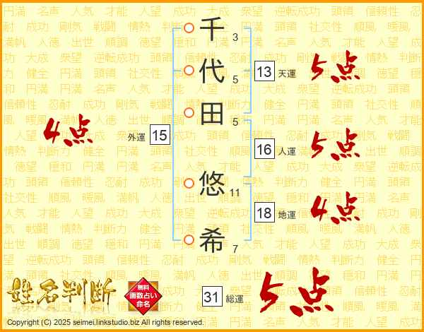 千(3画)代(5画)田(5画) 悠(11画)希(7画)