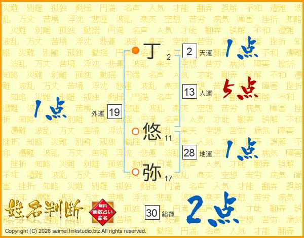 生活面を象徴する運勢です。外部から受ける影響力を表し、結婚運、家庭運や職場、環境への順応性を表します。総運から人運を引いた画数。姓や名が1文字の場合を除く。