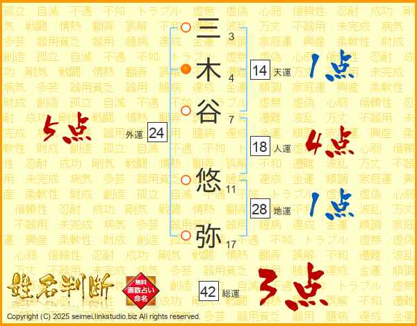 三(3画)木(4画)谷(7画) 悠(11画)弥(17画)