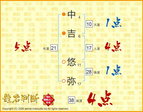 中(4画)吉(6画) 悠(11画)弥(17画)