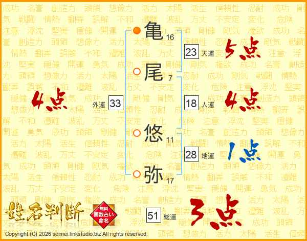 亀(16画)尾(7画) 悠(11画)弥(17画)