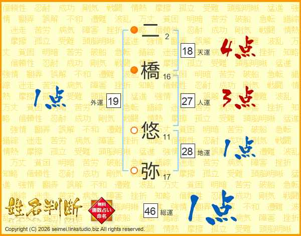 二(2画)橋(16画) 悠(11画)弥(17画)