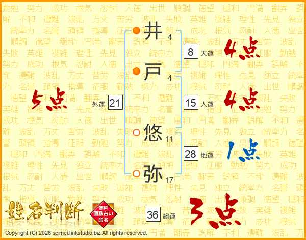井(4画)戸(4画) 悠(11画)弥(17画)
