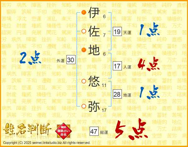 伊(6画)佐(7画)地(6画) 悠(11画)弥(17画)