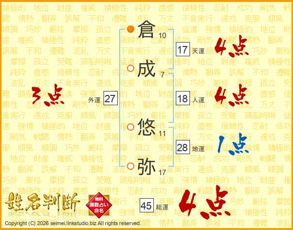 倉(10画)成(7画) 悠(11画)弥(17画)