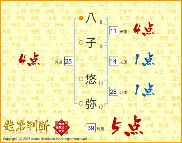 八子悠弥さんの総運は39画の5点!