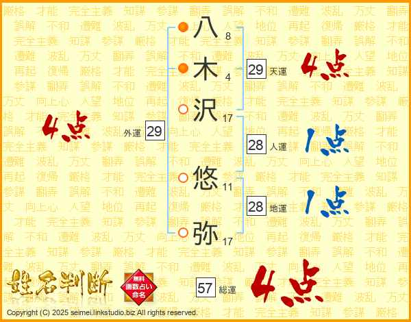 八(8画)木(4画)沢(17画) 悠(11画)弥(17画)