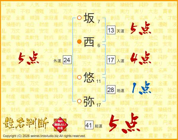 坂(7画)西(6画) 悠(11画)弥(17画)