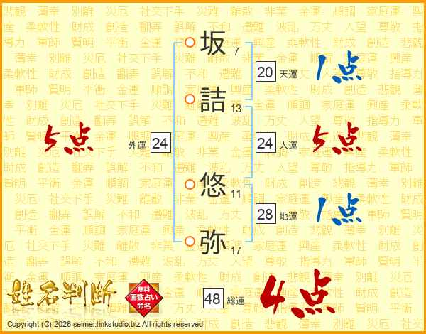 坂(7画)詰(13画) 悠(11画)弥(17画)