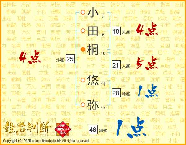 小(3画)田(5画)桐(10画) 悠(11画)弥(17画)