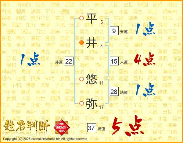 平(5画)井(4画) 悠(11画)弥(17画)