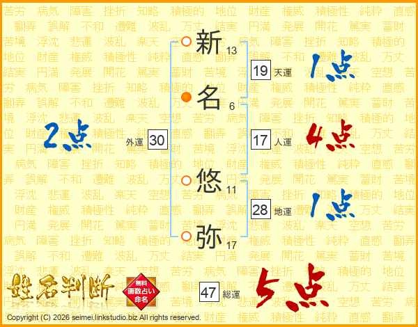 生活面を象徴する運勢です。外部から受ける影響力を表し、結婚運、家庭運や職場、環境への順応性を表します。総運から人運を引いた画数。姓や名が1文字の場合を除く。