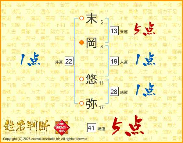 末(5画)岡(8画) 悠(11画)弥(17画)
