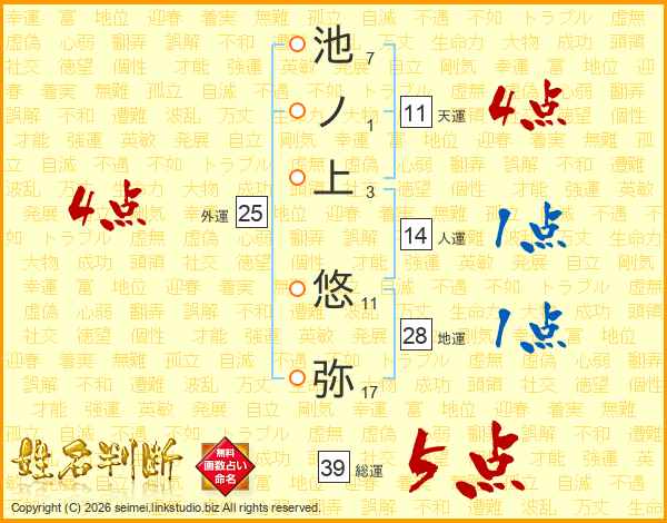 池ノ上悠弥さんの総運は39画の5点!