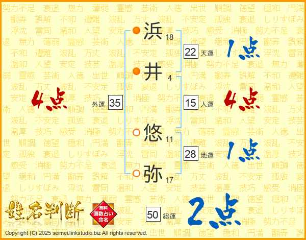 浜(18画)井(4画) 悠(11画)弥(17画)