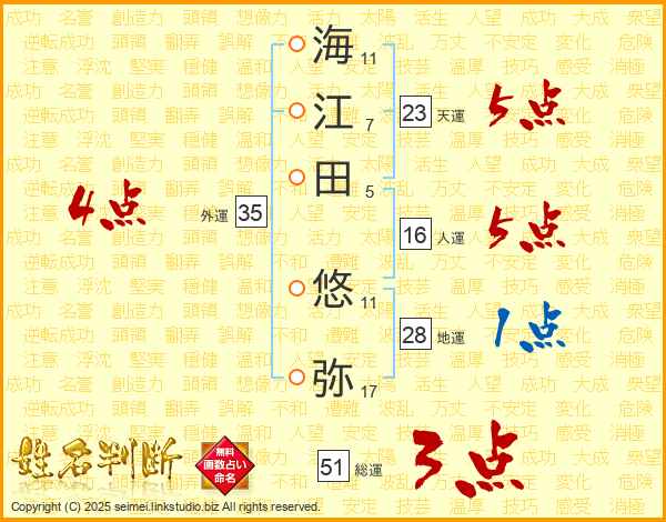 海(11画)江(7画)田(5画) 悠(11画)弥(17画)