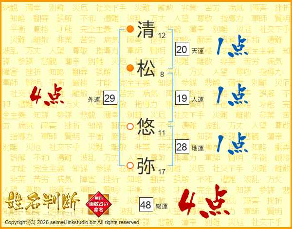 清(12画)松(8画) 悠(11画)弥(17画)