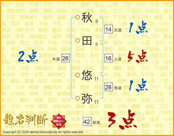 秋(9画)田(5画) 悠(11画)弥(17画)