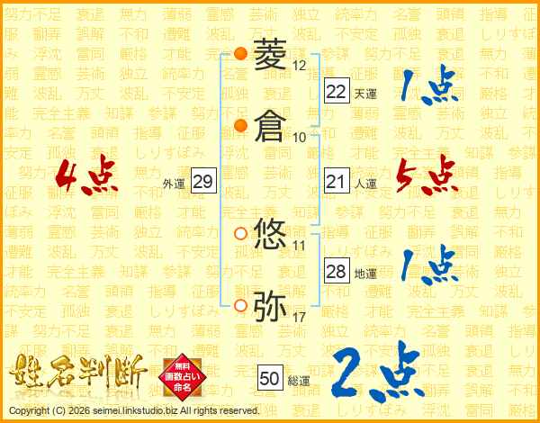 菱(12画)倉(10画) 悠(11画)弥(17画)