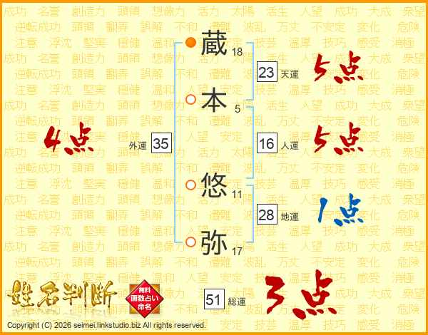 蔵(18画)本(5画) 悠(11画)弥(17画)