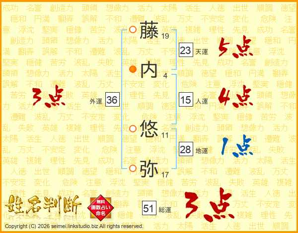 藤(19画)内(4画) 悠(11画)弥(17画)