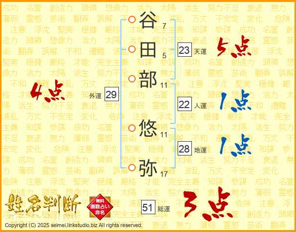 谷(7画)田(5画)部(11画) 悠(11画)弥(17画)