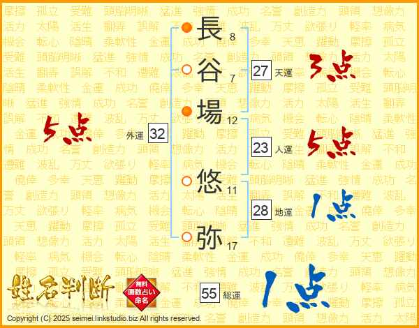 長(8画)谷(7画)場(12画) 悠(11画)弥(17画)