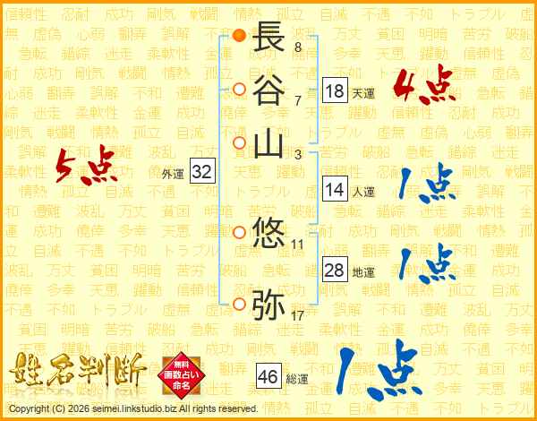 長(8画)谷(7画)山(3画) 悠(11画)弥(17画)