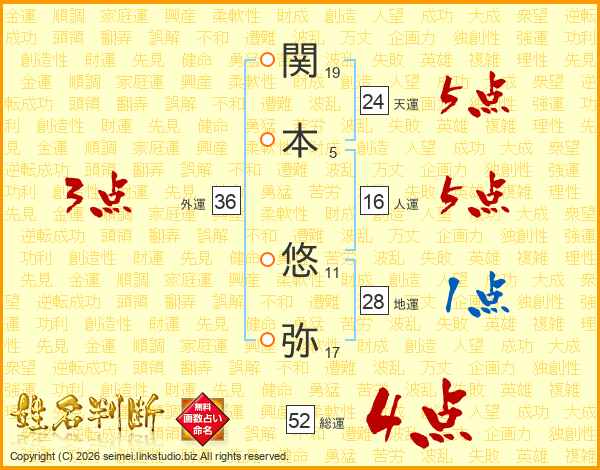 関(19画)本(5画) 悠(11画)弥(17画)