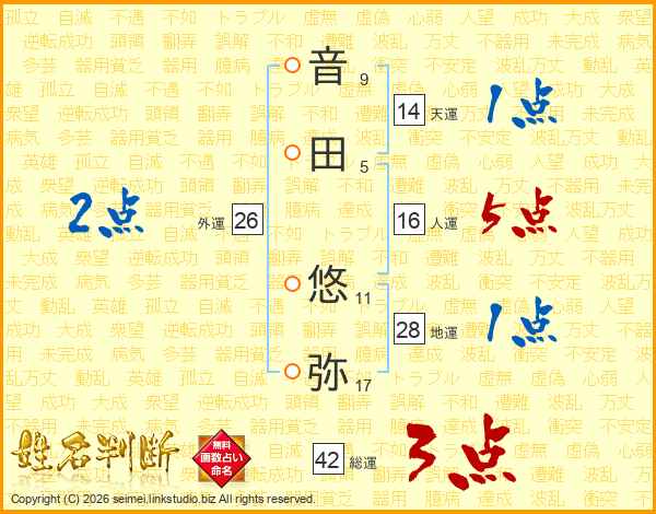 音(9画)田(5画) 悠(11画)弥(17画)