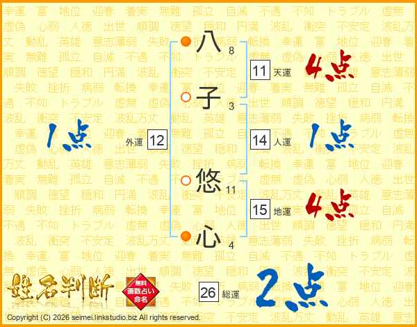 生活面を象徴する運勢です。外部から受ける影響力を表し、結婚運、家庭運や職場、環境への順応性を表します。総運から人運を引いた画数。姓や名が1文字の場合を除く。
