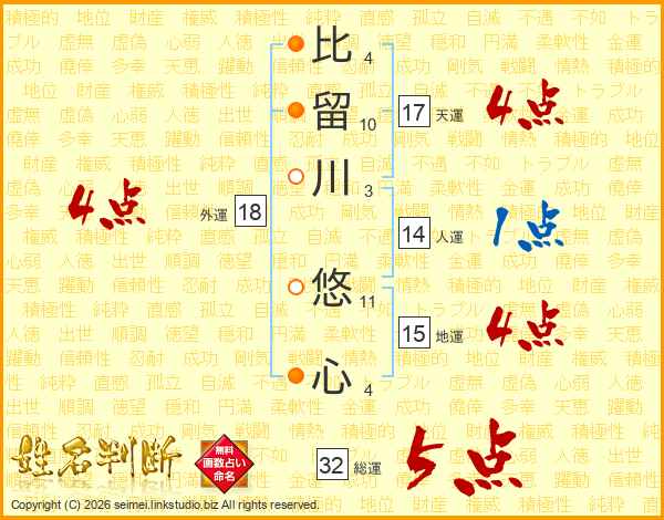 比(4画)留(10画)川(3画) 悠(11画)心(4画)