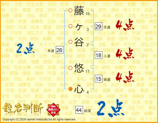 藤ヶ谷悠心さんの総運は44画の2点!