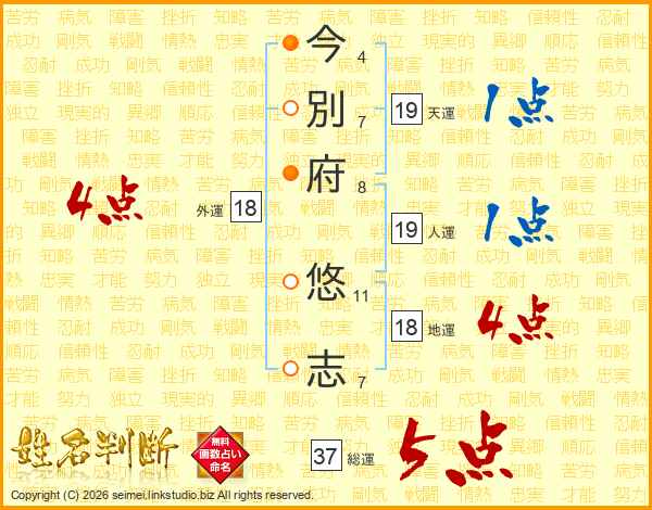 今(4画)別(7画)府(8画) 悠(11画)志(7画)