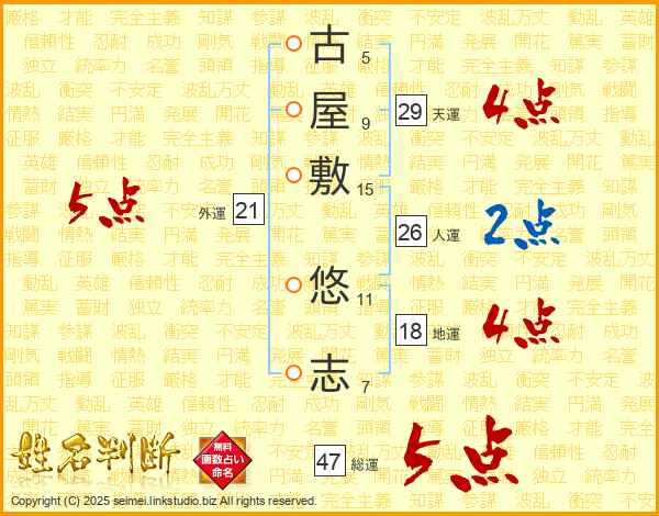 古(5画)屋(9画)敷(15画) 悠(11画)志(7画)