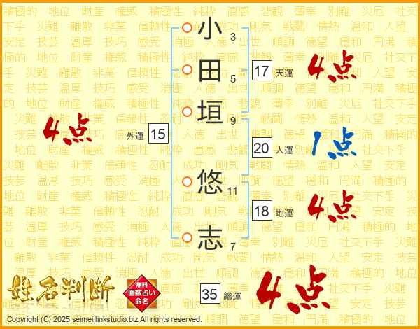 小(3画)田(5画)垣(9画) 悠(11画)志(7画)
