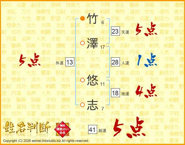 竹澤悠志さんの総運は41画の5点!