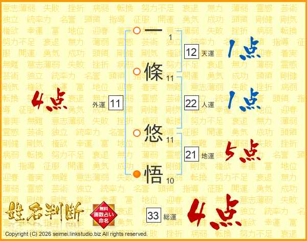 あなたの人生を表す1番重要な運勢です。生涯を通じて影響する総合運となり、主に50歳以降の晩年期に影響を及ぼします。苗字と名前の合計画数。