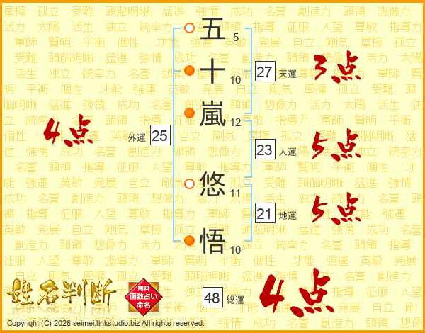 五(5画)十(10画)嵐(12画) 悠(11画)悟(10画)
