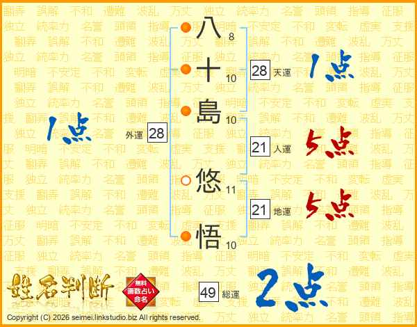 八(8画)十(10画)島(10画) 悠(11画)悟(10画)